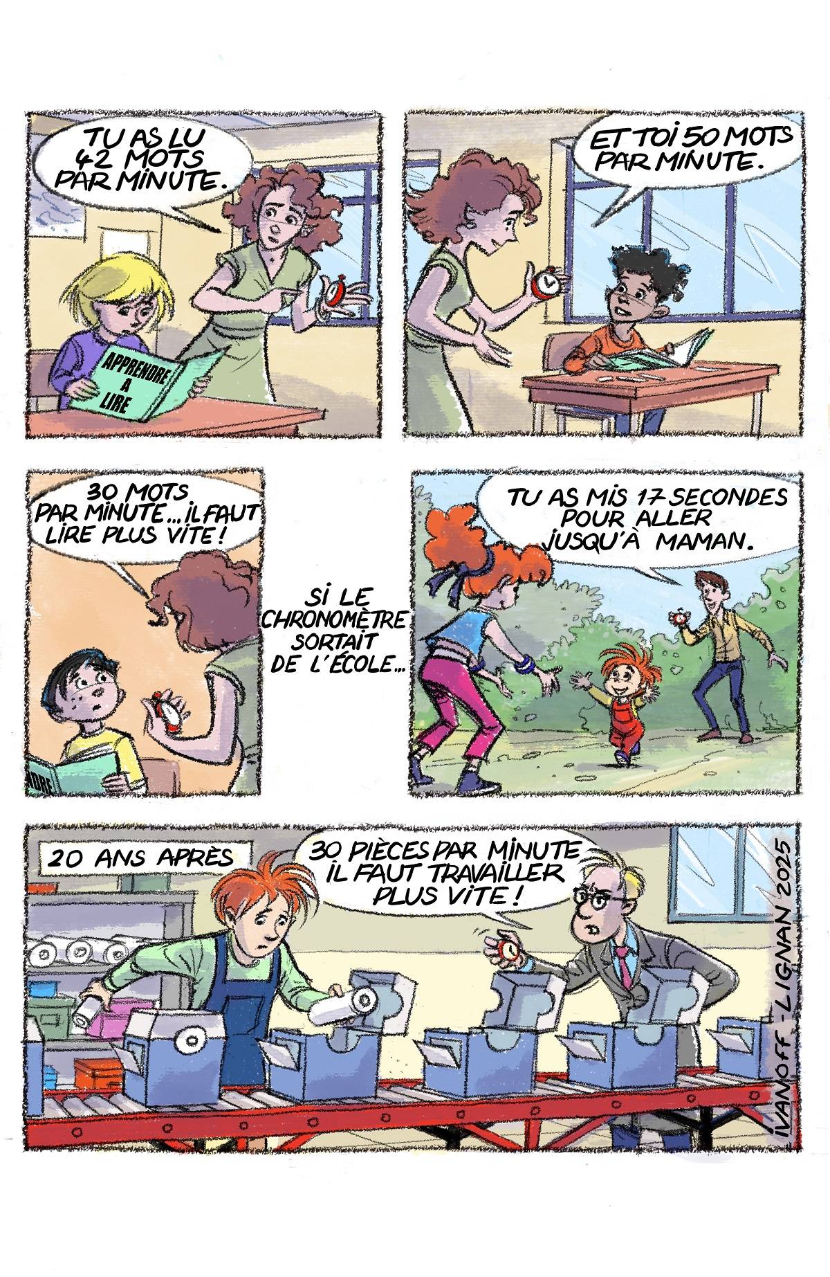 L’introduction d’une évaluation de vitesse chiffrée au moment où les enfants apprennent à lire interroge. Ne les installe-t-on pas d’entrée dans un rapport biaisé à la lecture ? L’adulte n’a pas besoin de noter un temps pour se rendre compte qu’un enfant lit de manière fluide ou encore hésitante. On peut se demander si ce n’est pas la volonté de produire des éléments chiffrés et quantifiables, des tableaux à double entrée, camemberts statistiques et autres courbes de progression qui motivent cette pratique du chronomètre. « Quand un outil n’est plus au service de l’homme, mais que c’est l’homme qui est au service de l’outil, cet outil a alors dépassé ce qu’on appelle son seuil de convivialité.1 » Le chronomètre n’aurait-il pas ici comme but premier d’attester de manière scientifique et quantifiable, le sérieux du travail d’enseignement ?